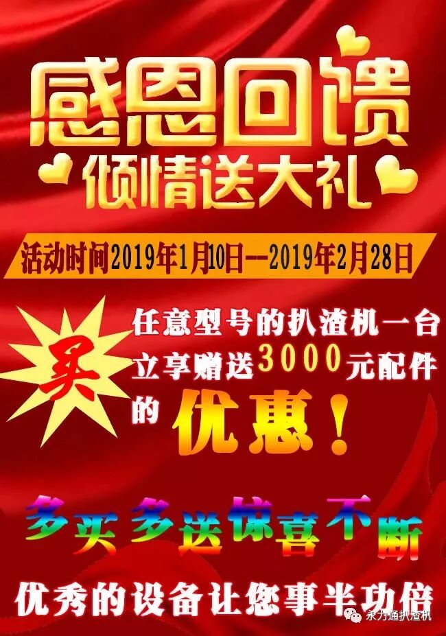 年关已近, 为了回馈新老用户对永力通长期以来的支持与信赖,在2019年1月10至2019年2月28日期间特推出购一台设备即送3000元配件优惠活动,永力通矿用出渣设备扒渣机机型全都有,现货供应,价格便宜,永力通扒渣机“质”在,让您的出渣更“自在”!欢迎来电咨询!