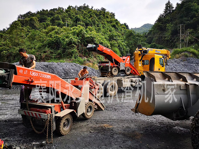 罗总的工地是2米宽2米高的隧洞,平巷没有坡度,拐弯也不是很急,用的是时风三轮车配合出渣,厂家推荐其使用60型轮式皮带扒渣机,罗总要求一台带柴油机,另一台不带柴油机。